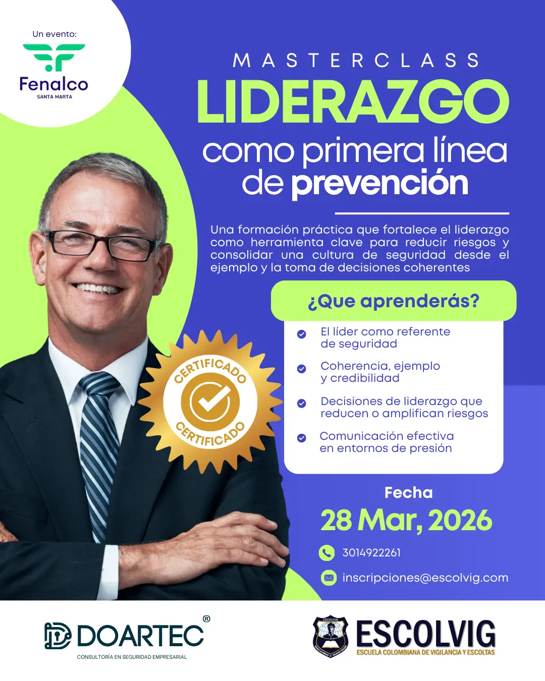 En alianza con Doartec, Escolvig y Fenalco Santa Marta, te invitamos a participar en esta poderosa masterclass donde fortalecerás tu capacidad de tomar decisiones seguras, coherentes y estratégicas dentro de tu organización.